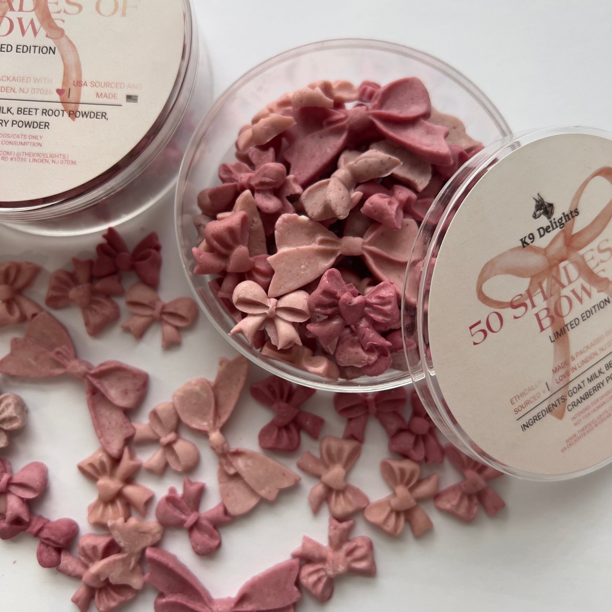 50 Shades of Bow 🎀 - These bite sized candies are the perfect topper to add to any pets meal for an instant touch of "cuteness". Made with 100% goat milk and veggie powders, some of it's benefits include...